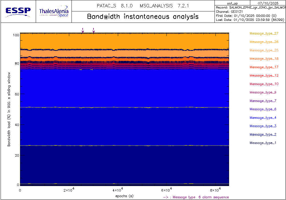 This plot shows, for every second over 24h, the distribution (in percentage) of the SBAS messages over an sliding window of 900 seconds, representing the bandwidth used to transmit each of the SBAS messages.