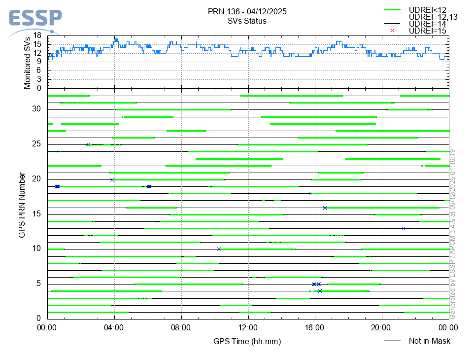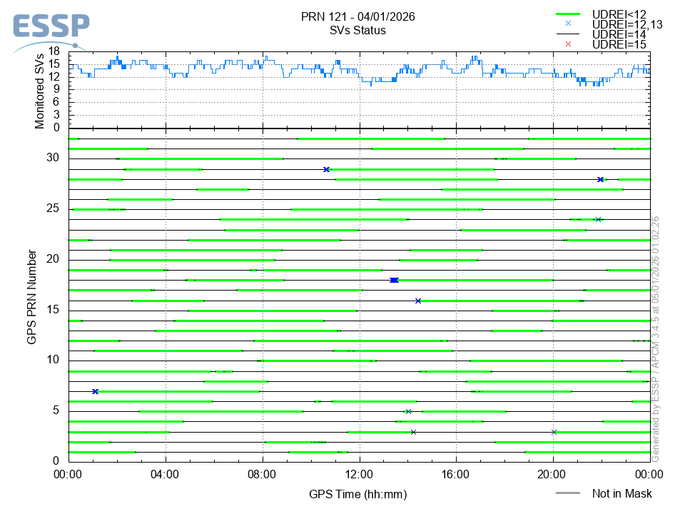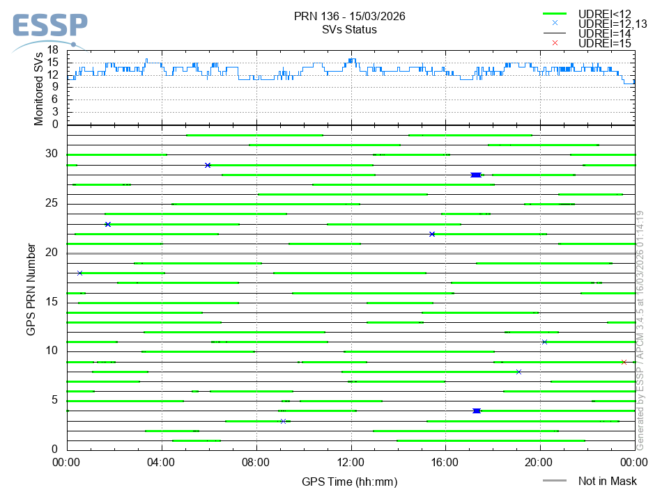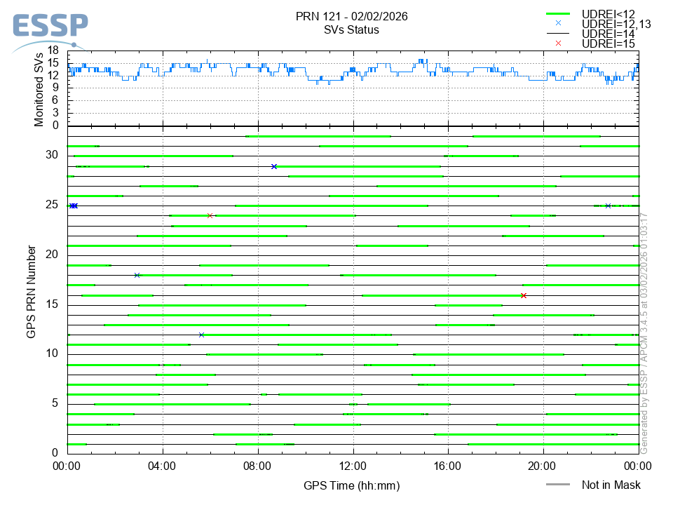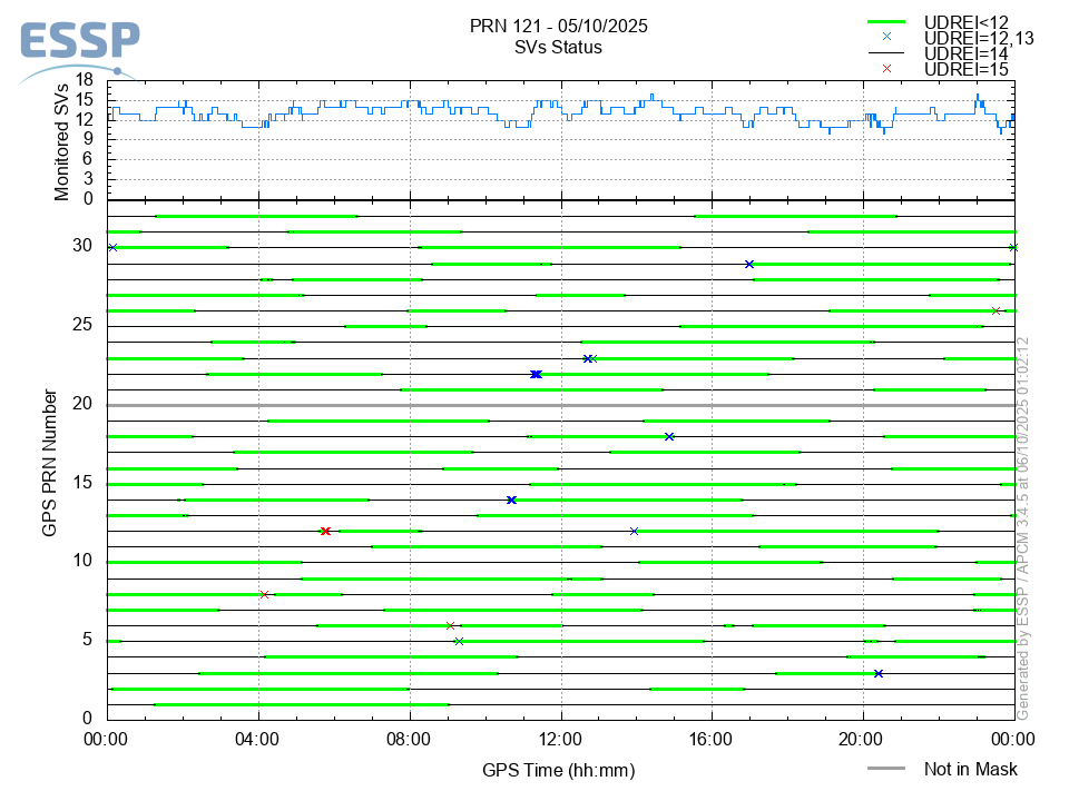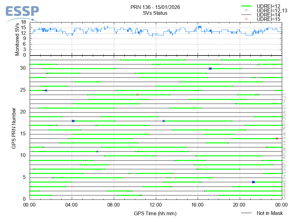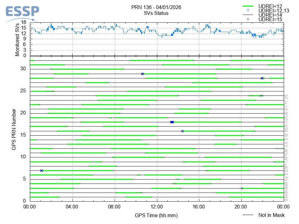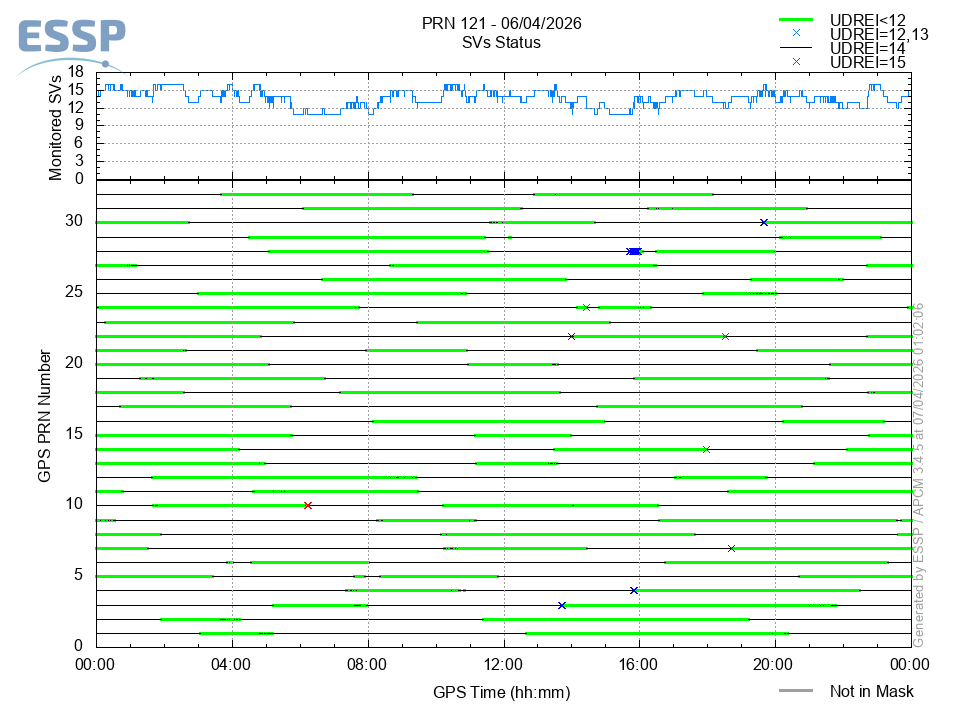 This section shows the daily EGNOS satellite monitoring status. It is shown the number of monitored SVs (Space Vehicles) and the monitoring status of each of these satellites in function of its UDREI: