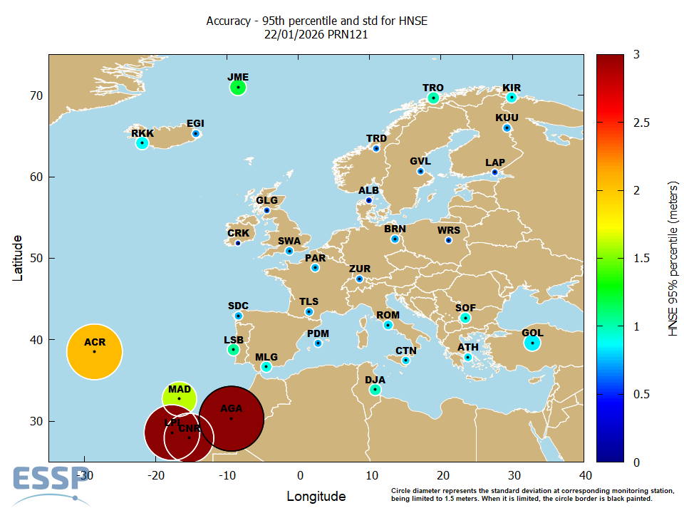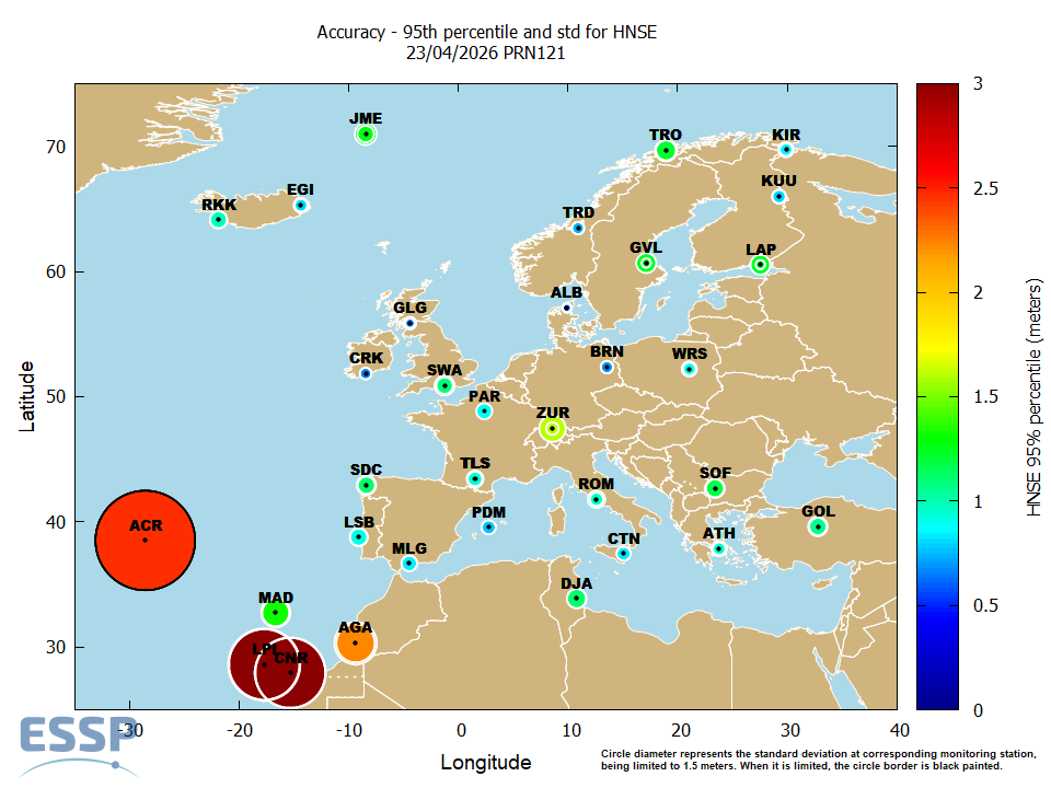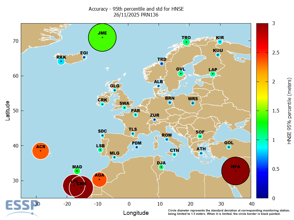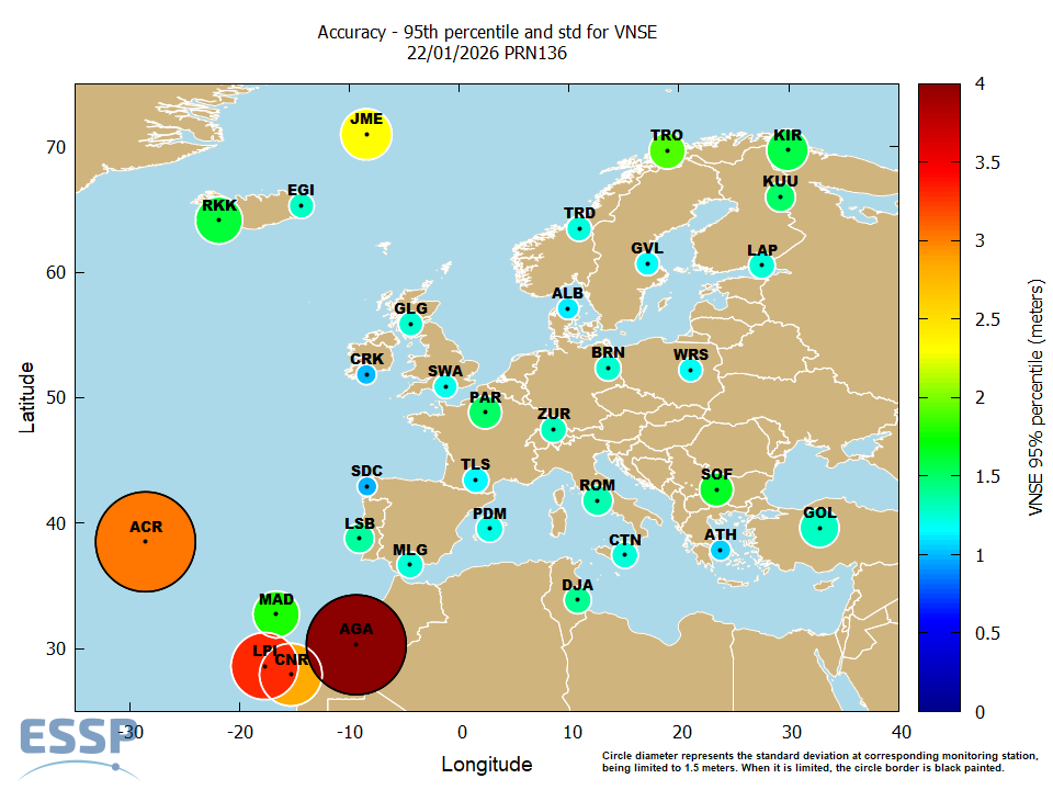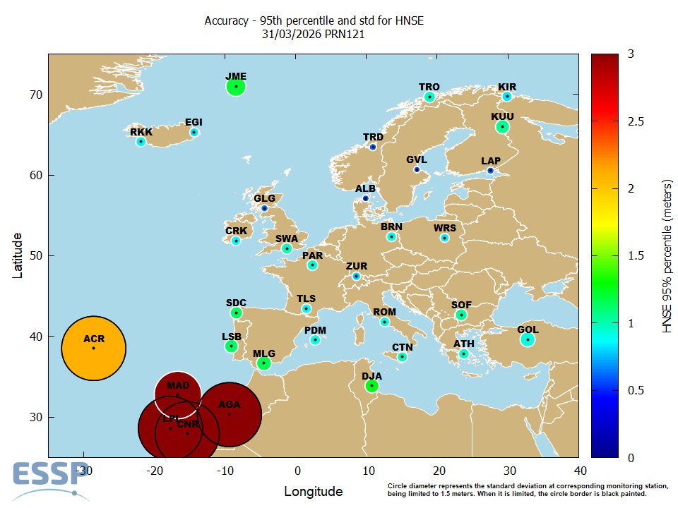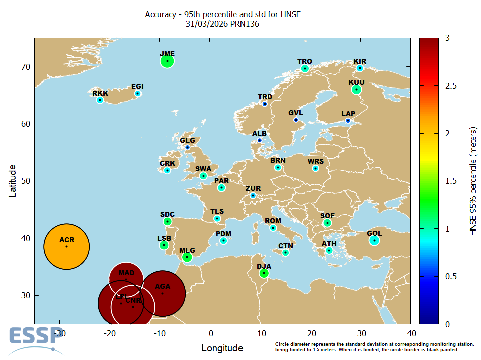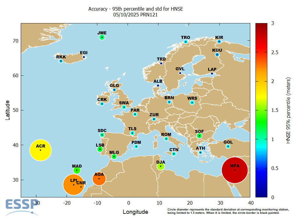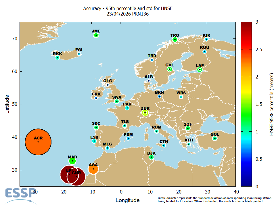 This section shows the daily Navigation System Error (NSE) at every RIMS. The NSE must be understood as the difference between the true position and the estimated position, and the presented figures include the percentile 95 of this NSE (represented by the color scale) and the standard deviation of the NSE distribution (represented by the size of the circles) at every RIMS.