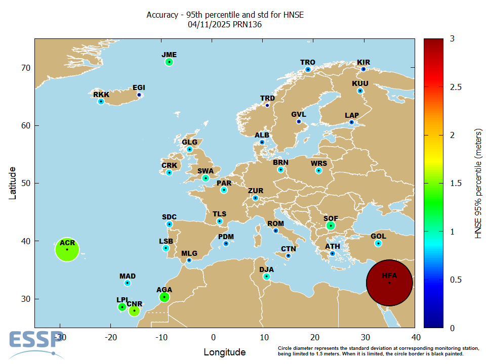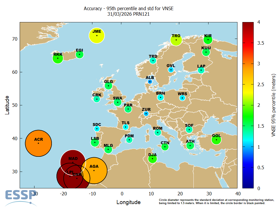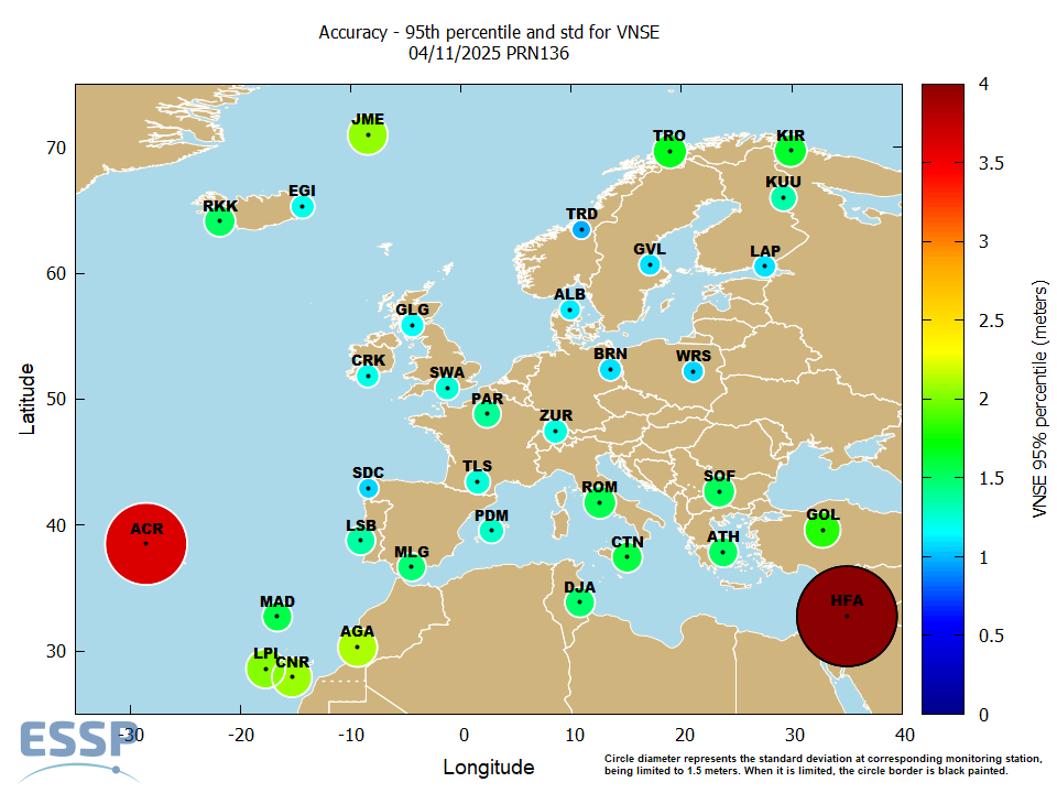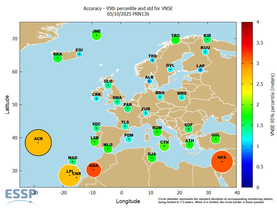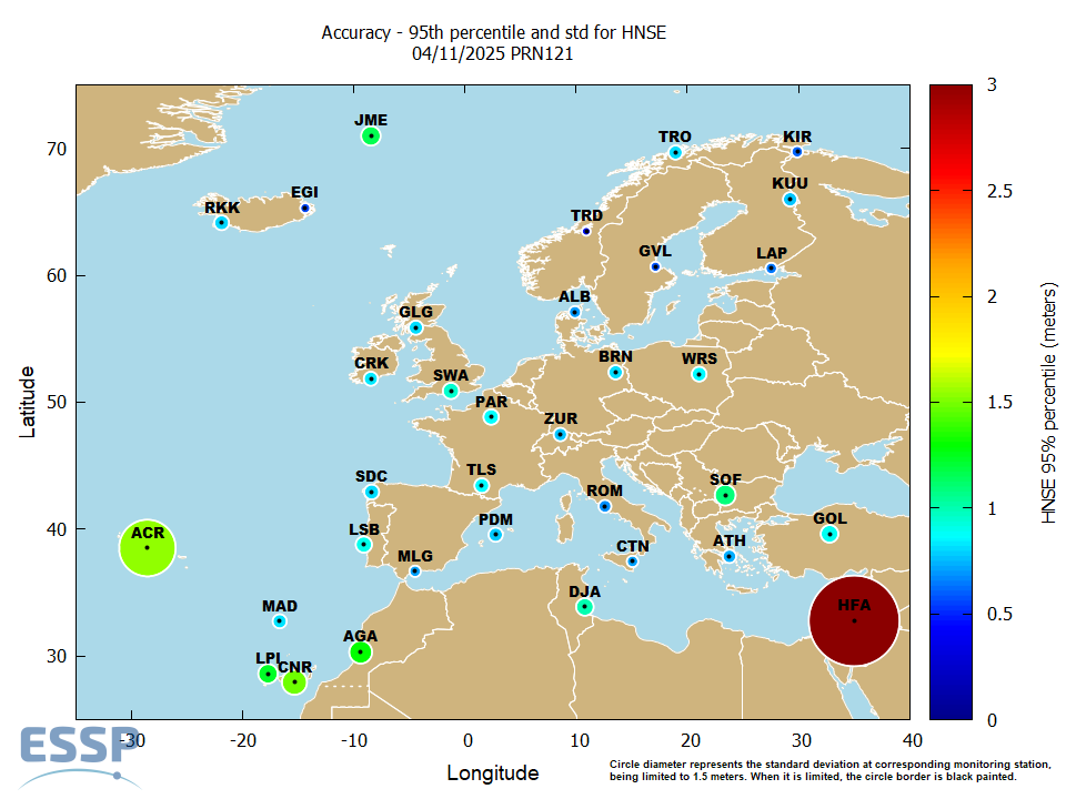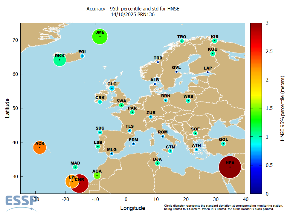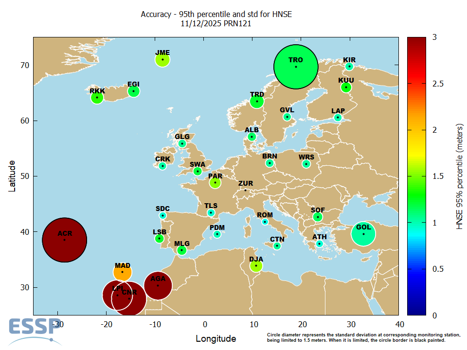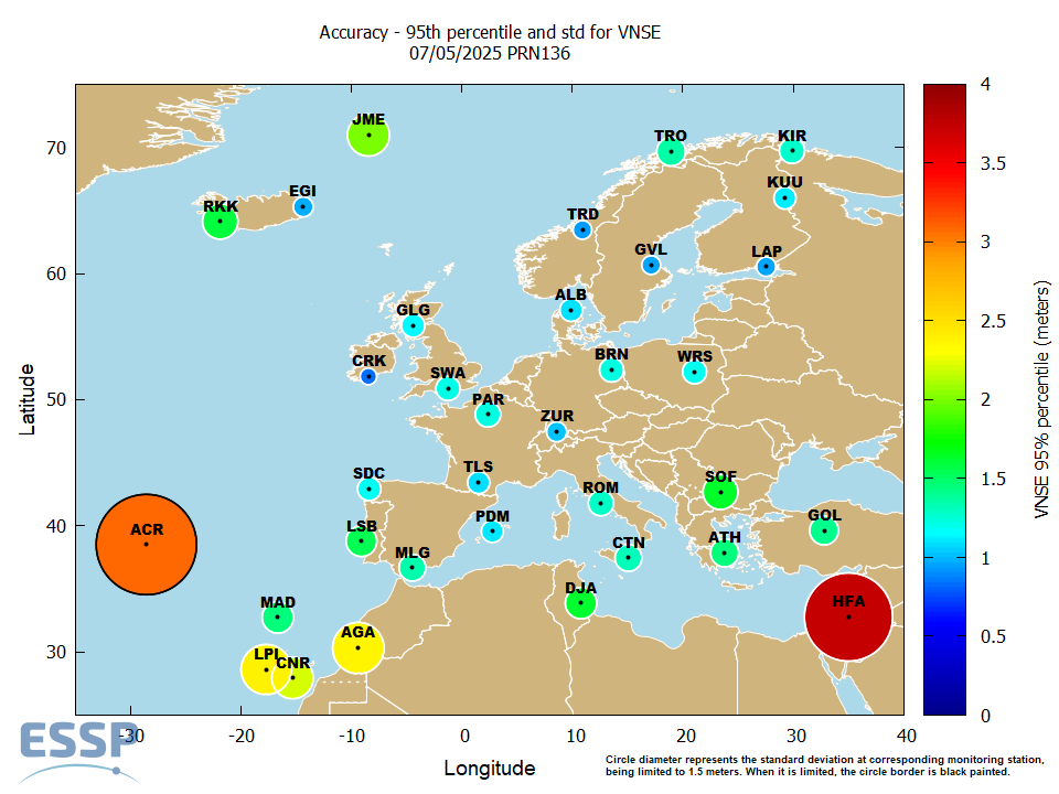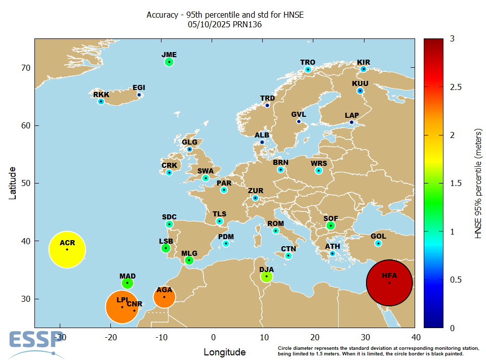 This section shows the daily Navigation System Error (NSE) at every RIMS. The NSE must be understood as the difference between the true position and the estimated position, and the presented figures include the percentile 95 of this NSE (represented by the color scale) and the standard deviation of the NSE distribution (represented by the size of the circles) at every RIMS.