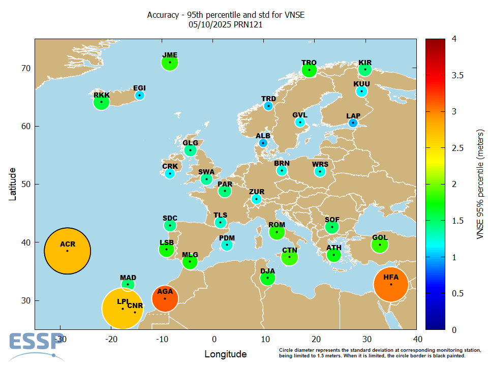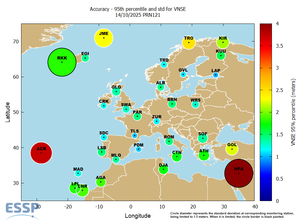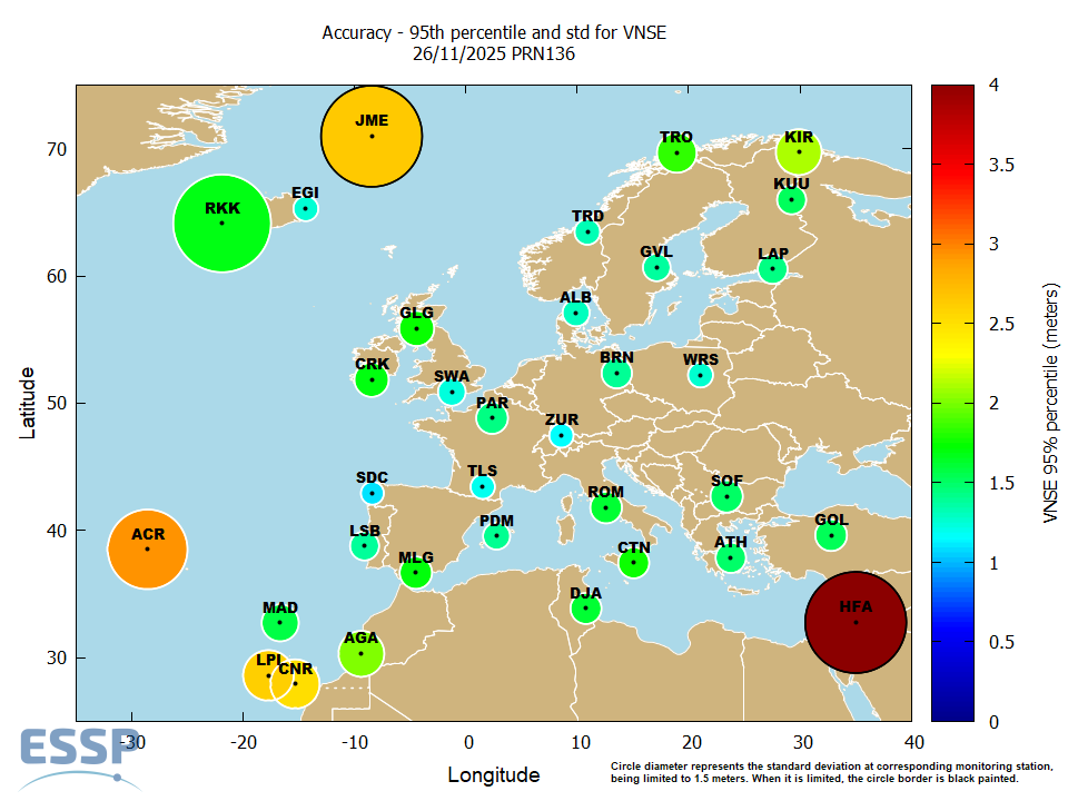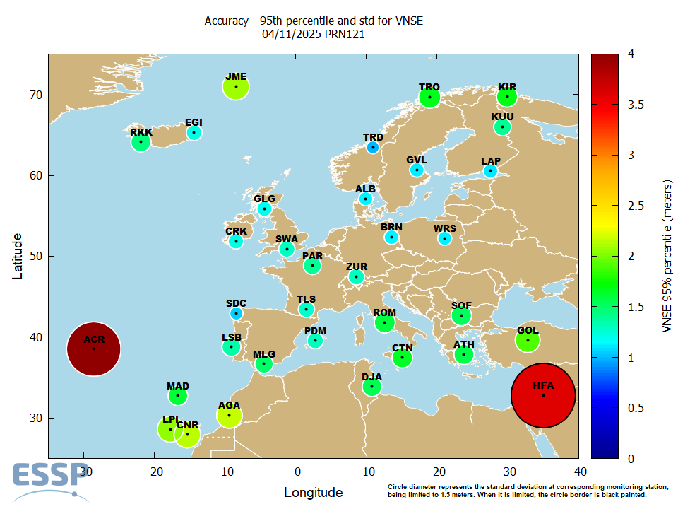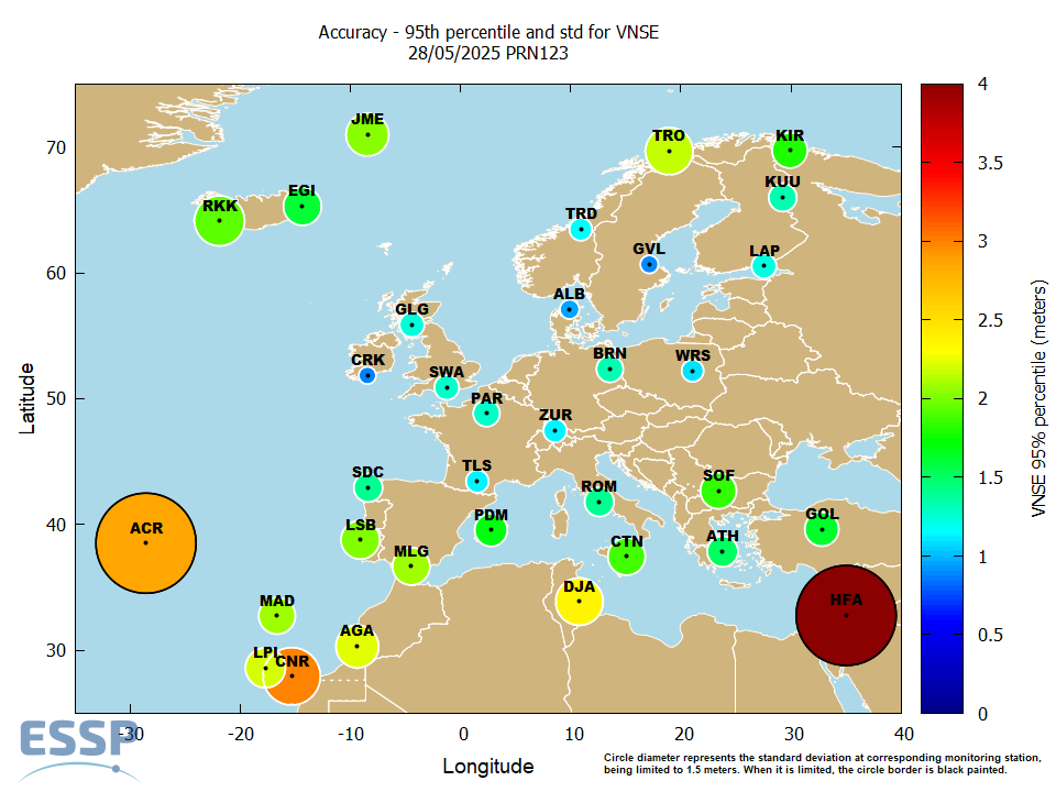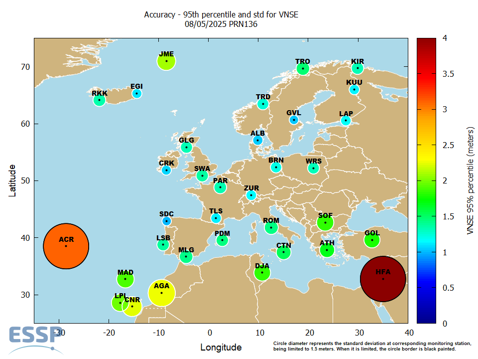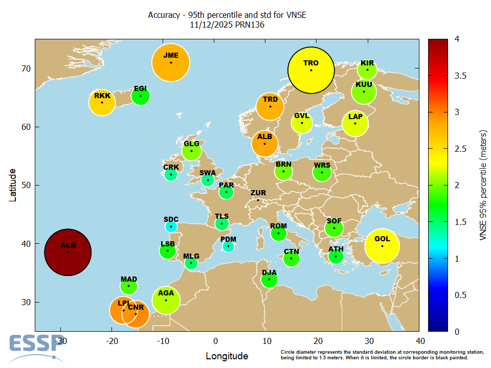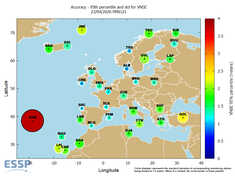 This section shows the daily Navigation System Error (NSE) at every RIMS. The NSE must be understood as the difference between the true position and the estimated position, and the presented figures include the percentile 95 of this NSE (represented by the color scale) and the standard deviation of the NSE distribution (represented by the size of the circles) at every RIMS.