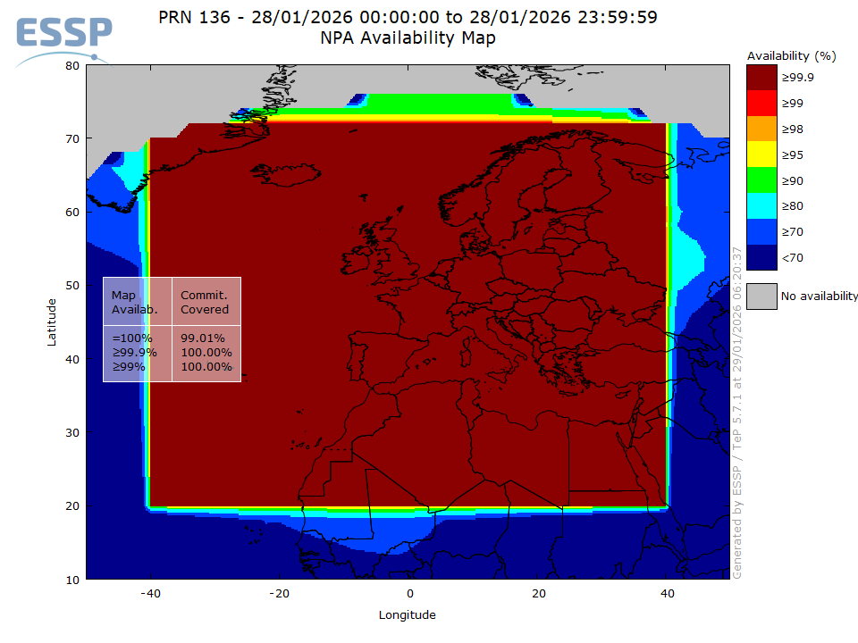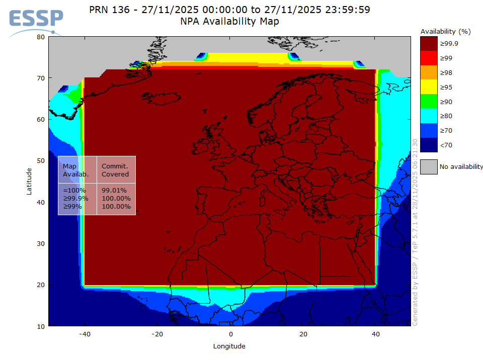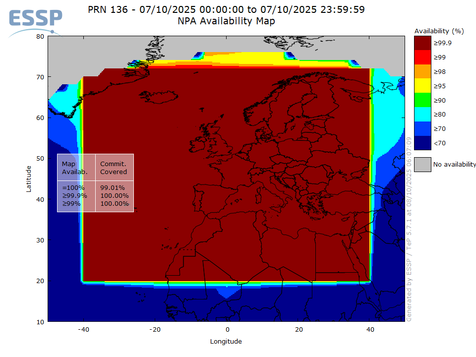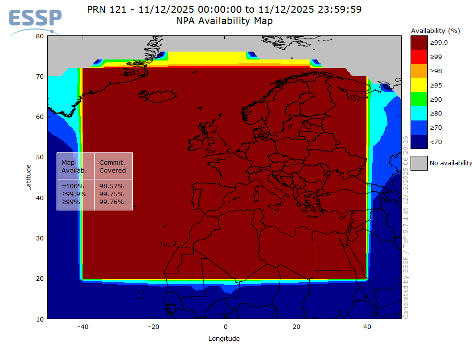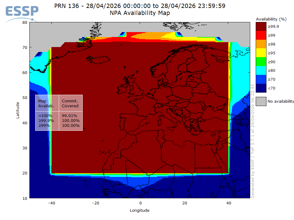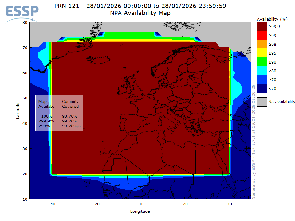EGNOS NPA Availability is defined as the percentage of samples in which the Horizontal Protection Level is below Alert Limit for NPA (HPL below 556m) over the total period. The figures present the daily EGNOS NPA Availability for the operational GEO satellites and their combination. Please, select a date in the calendar field to see the EGNOS APV-I Availability for such date.