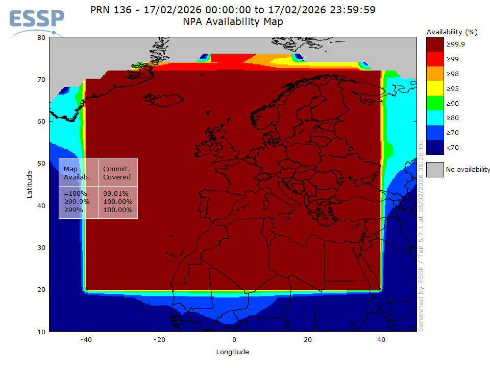 EGNOS NPA Availability is defined as the percentage of samples in which the Horizontal Protection Level is below Alert Limit for NPA (HPL below 556m) over the total period.