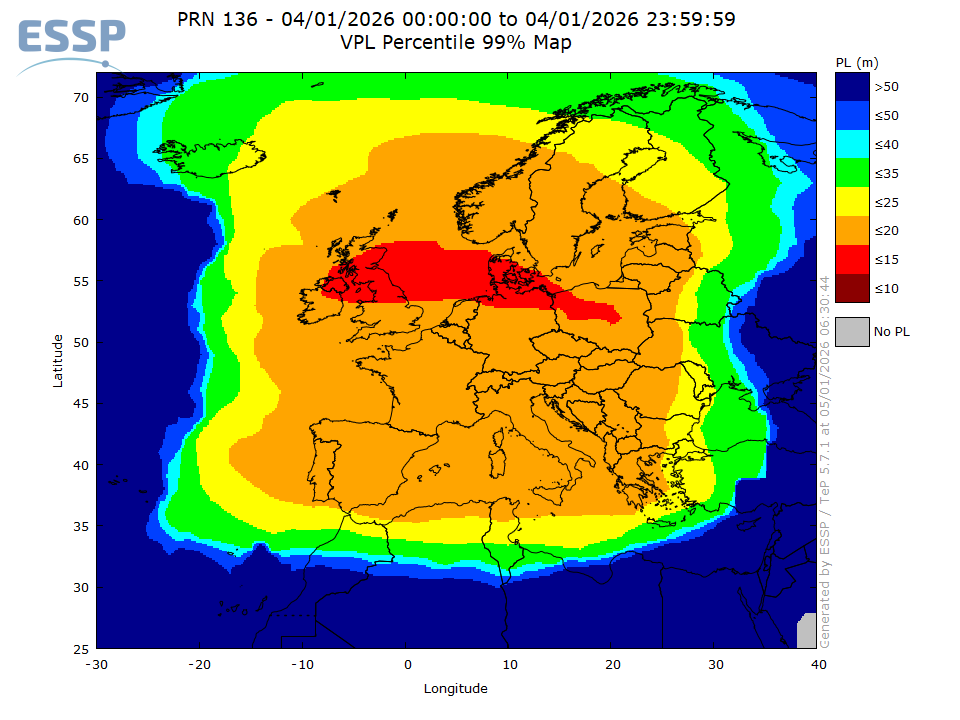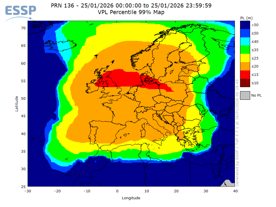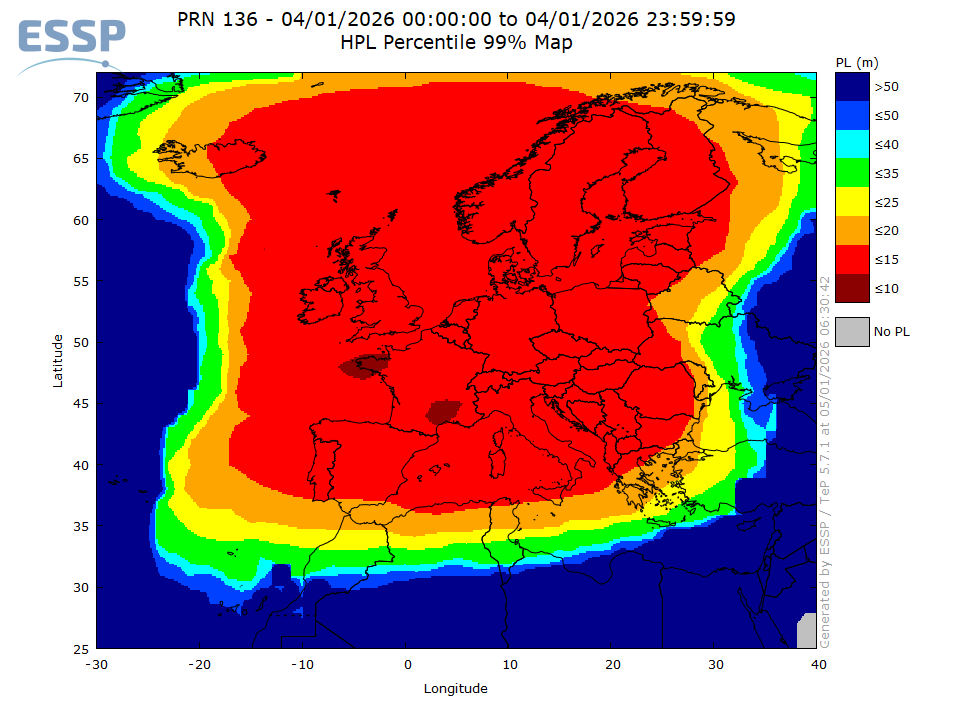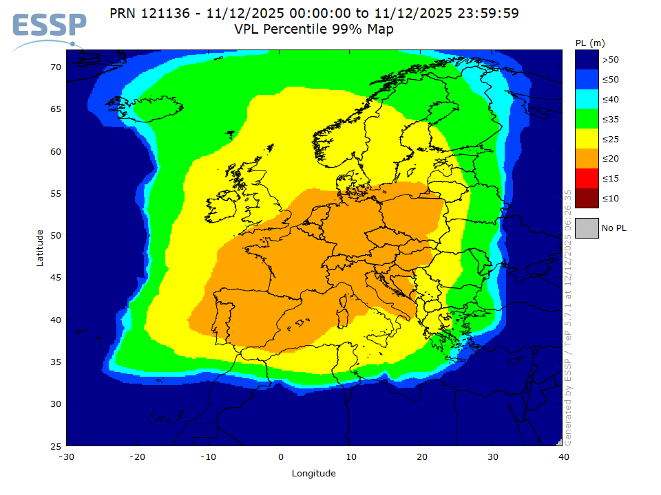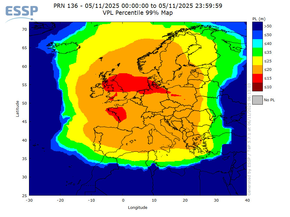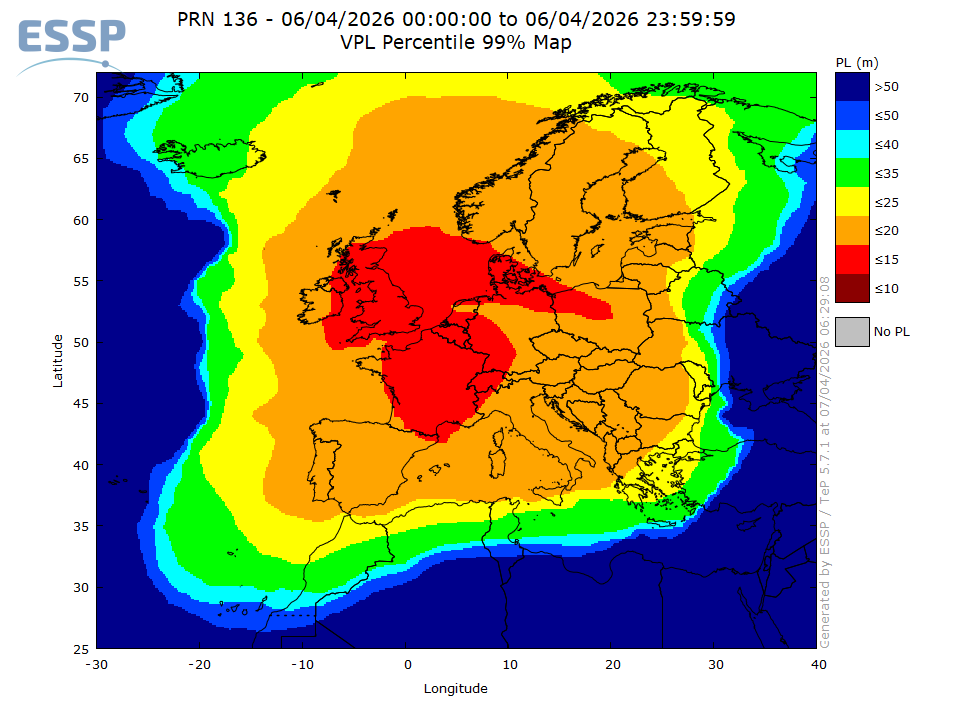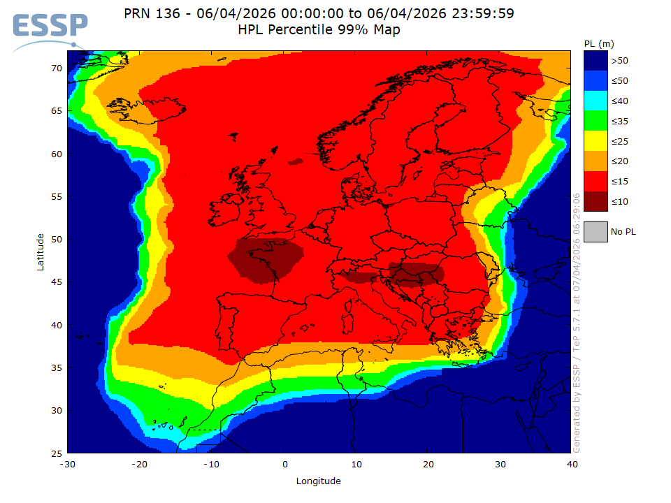 The Horizontal Protection Level (HPL) is the radius of a circle in the horizontal plane, with its centre being at the true position, which describes the region assured to contain the indicated horizontal position. The Vertical Protection Level (VPL) is the half length of a segment on the vertical axis with its centre being at the true position, which describes the region assured to contain the indicated vertical position. In other words, the HPL bounds the horizontal position error with a confidence level derived from the integrity risk requirement. Similarly, the VPL bounds the Vertical Position Error. The figures present HPL and VPL over the selected day for the operational GEO satellites and their combination.