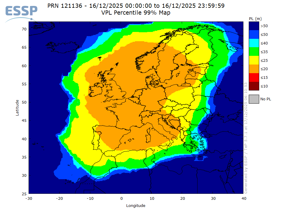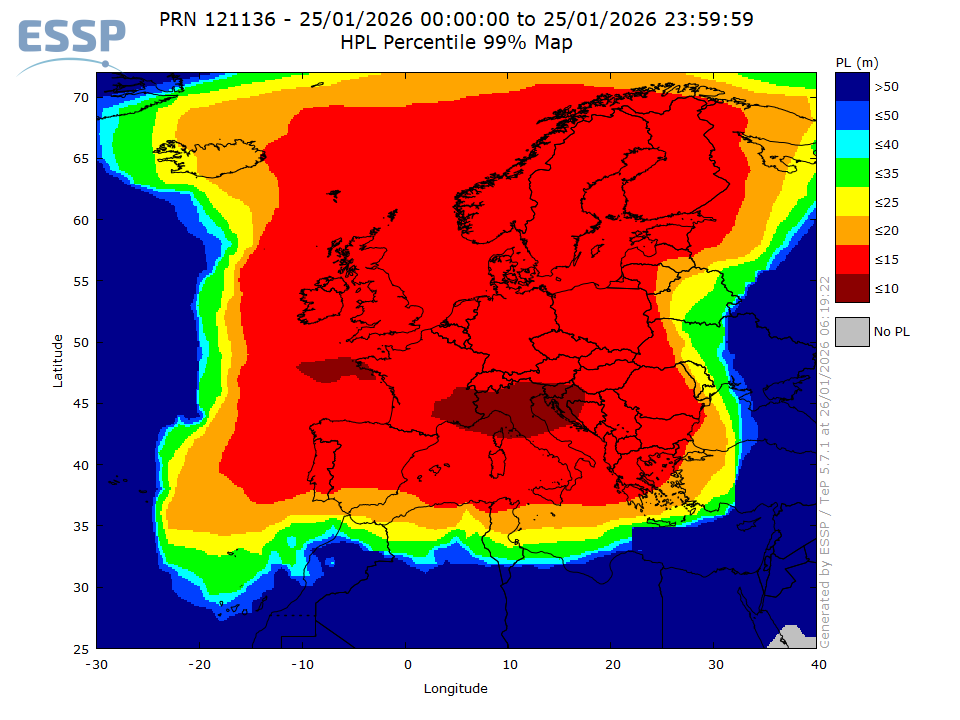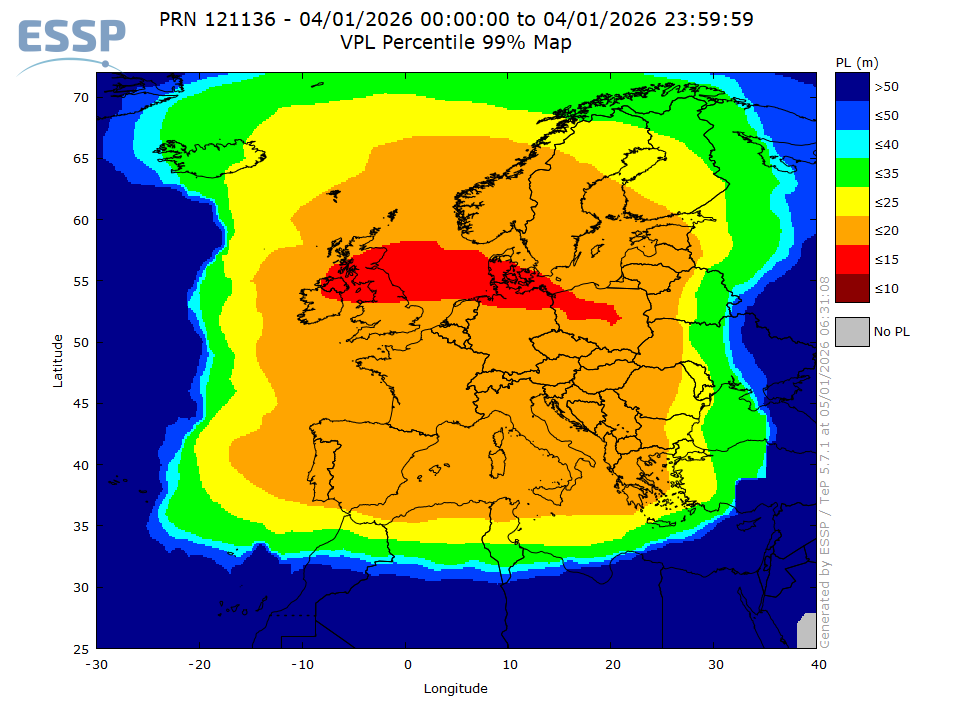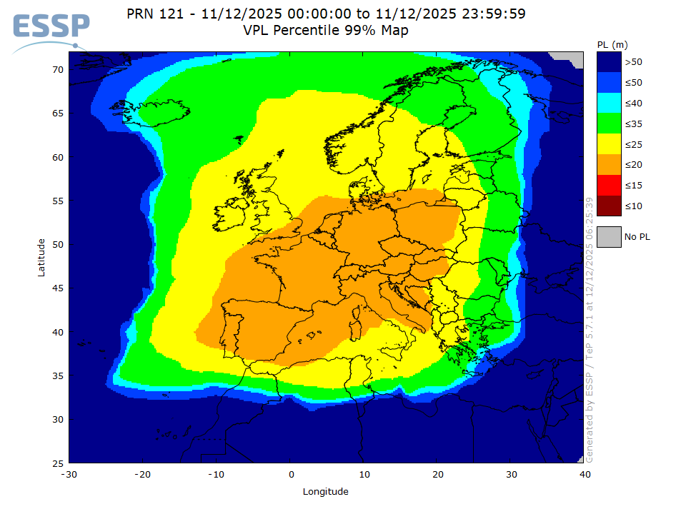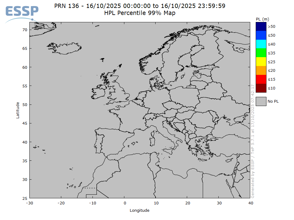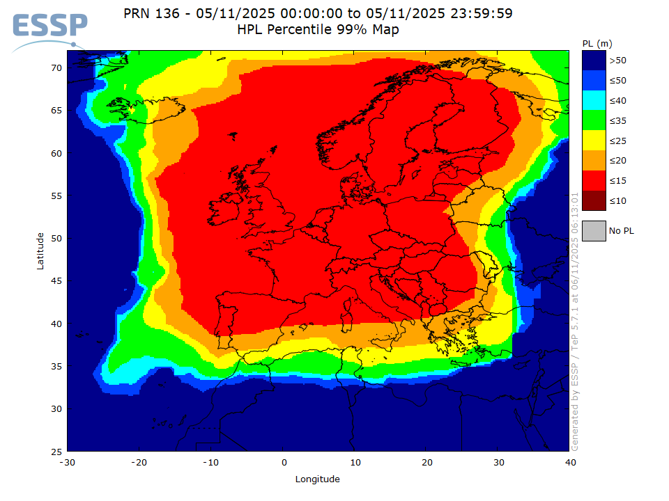 The Horizontal Protection Level (HPL) is the radius of a circle in the horizontal plane, with its centre being at the true position, which describes the region assured to contain the indicated horizontal position. The Vertical Protection Level (VPL) is the half length of a segment on the vertical axis with its centre being at the true position, which describes the region assured to contain the indicated vertical position. In other words, the HPL bounds the horizontal position error with a confidence level derived from the integrity risk requirement. Similarly, the VPL bounds the Vertical Position Error. The figures present HPL and VPL over the selected day for the operational GEO satellites and their combination.