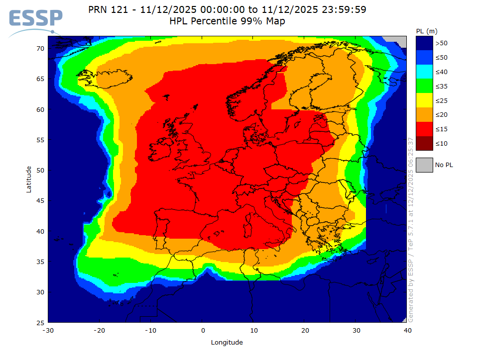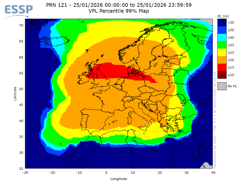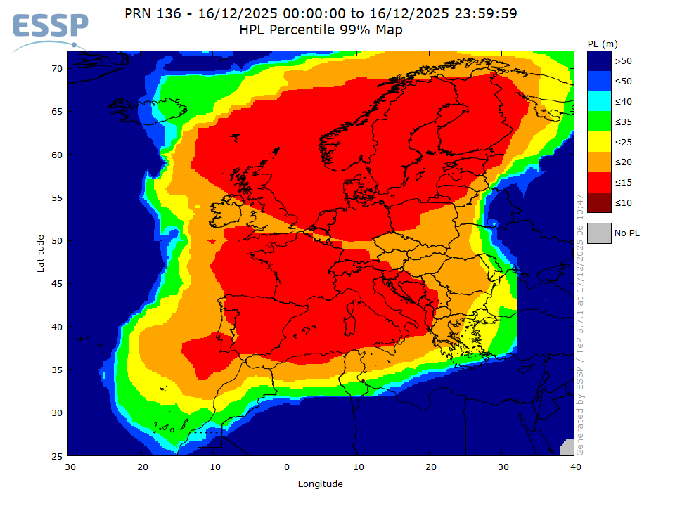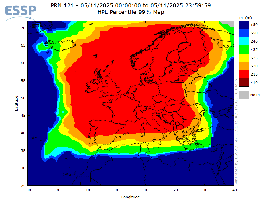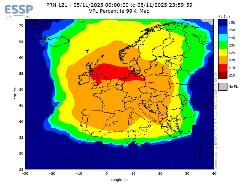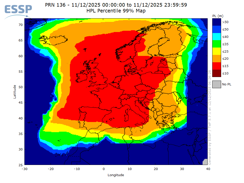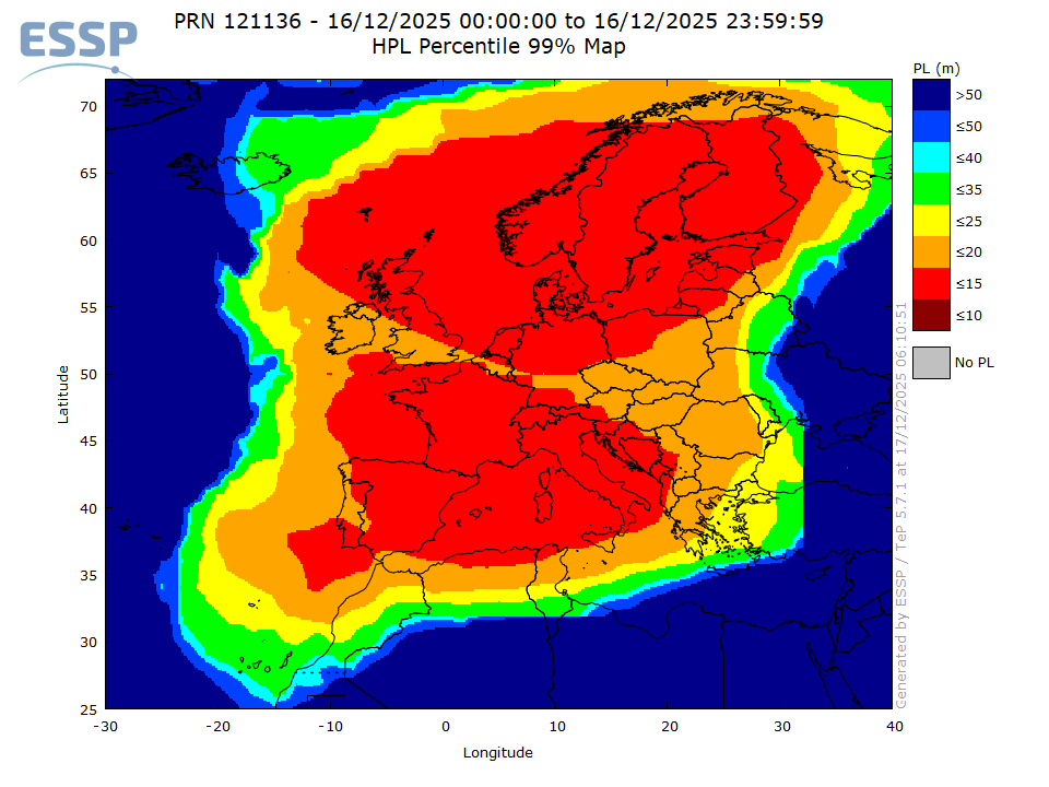 The Horizontal Protection Level (HPL) is the radius of a circle in the horizontal plane, with its centre being at the true position, which describes the region assured to contain the indicated horizontal position. The Vertical Protection Level (VPL) is the half length of a segment on the vertical axis with its centre being at the true position, which describes the region assured to contain the indicated vertical position. In other words, the HPL bounds the horizontal position error with a confidence level derived from the integrity risk requirement. Similarly, the VPL bounds the Vertical Position Error. The figures present HPL and VPL over the selected day for the operational GEO satellites and their combination.